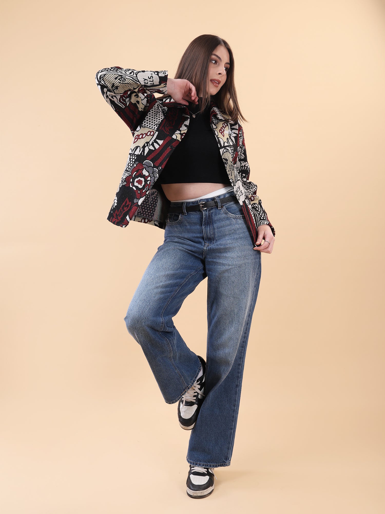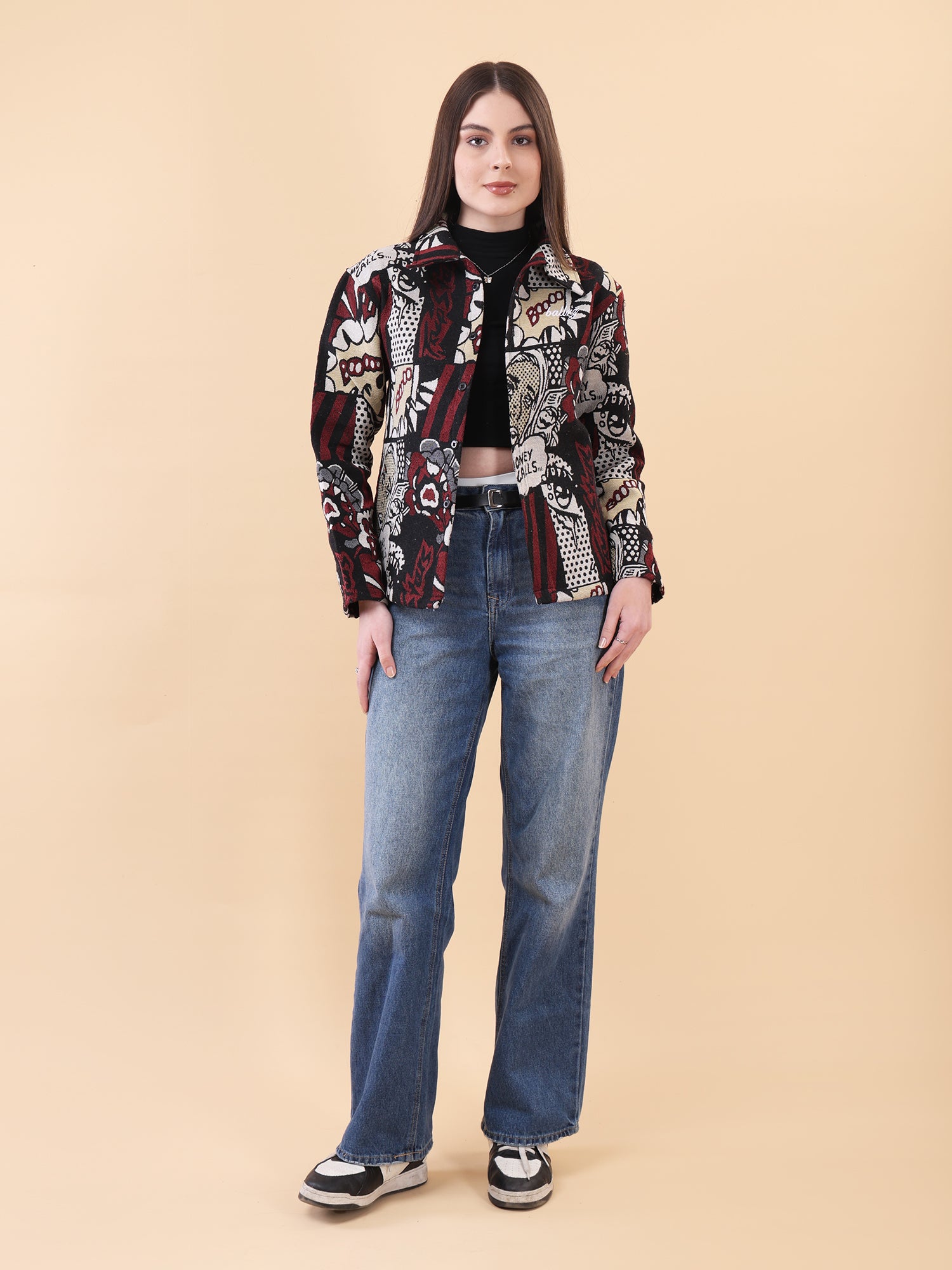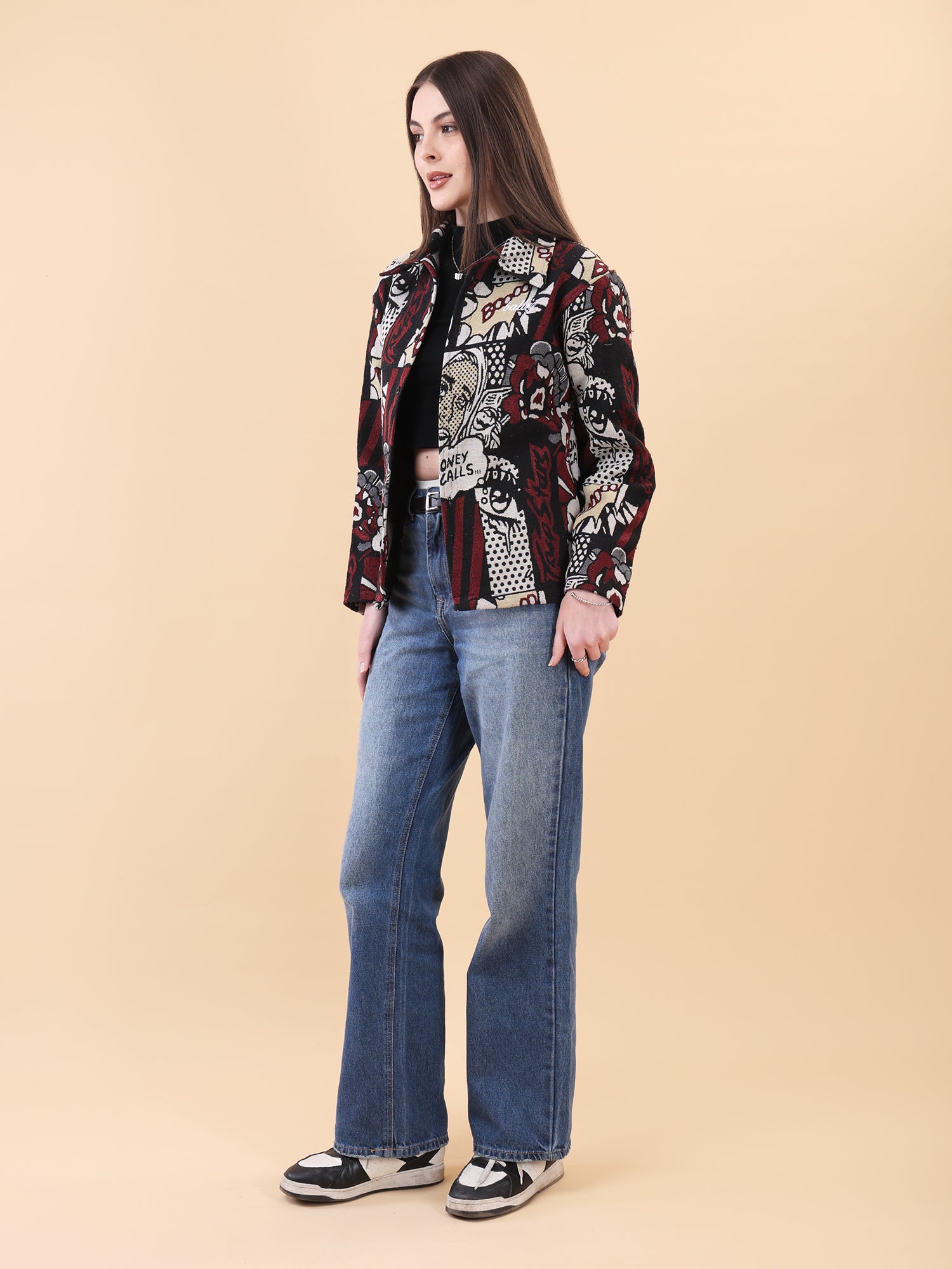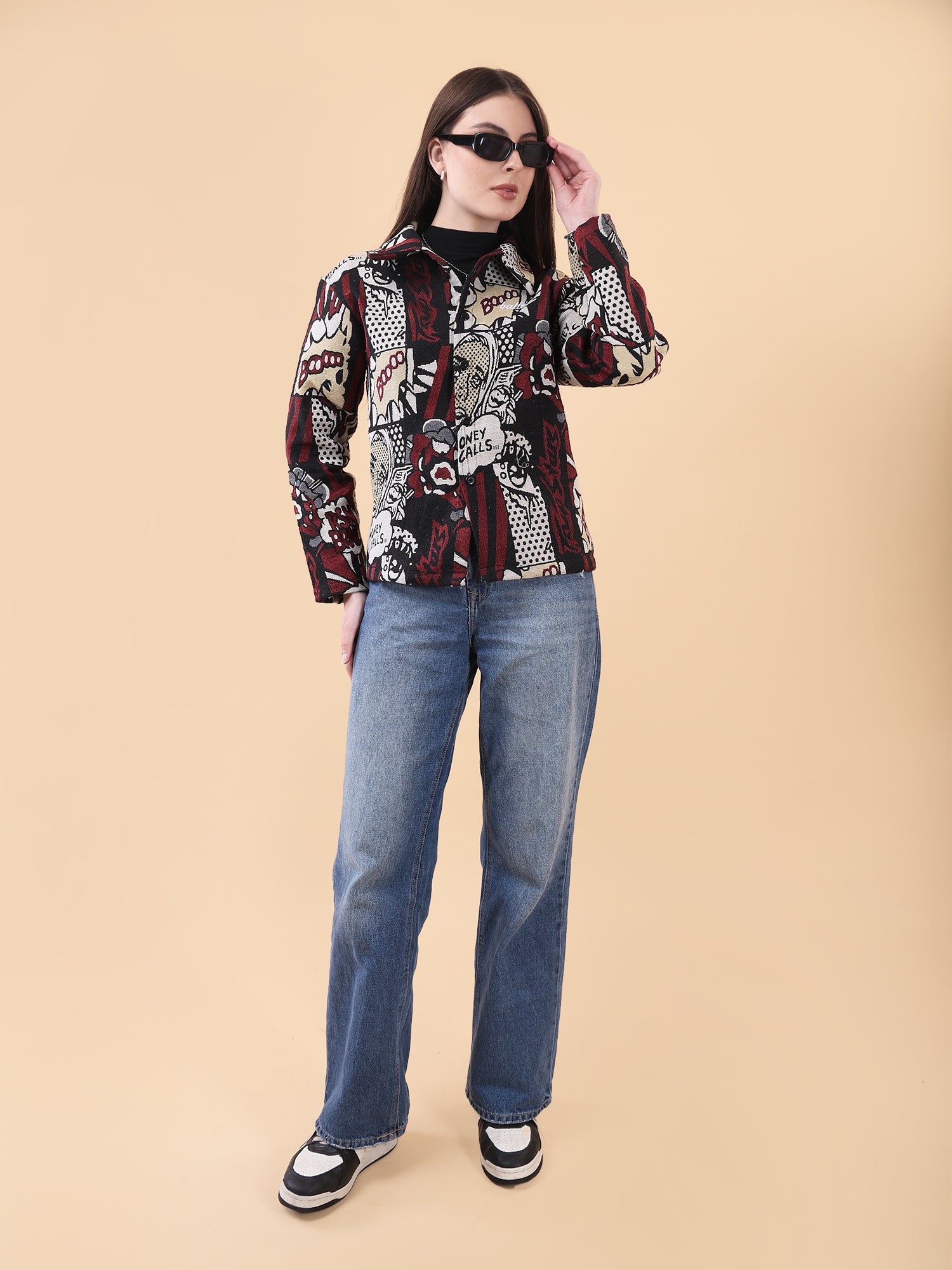 Designed in a relaxed fit, it’s perfect for layering or wearing solo. The striking red, black, and neutral tones elevate everyday denim, making it a go-to piece for day-to-night street looks. Whether you’re stepping out or standing out, this shaket speaks loud—because when money calls, style answers.