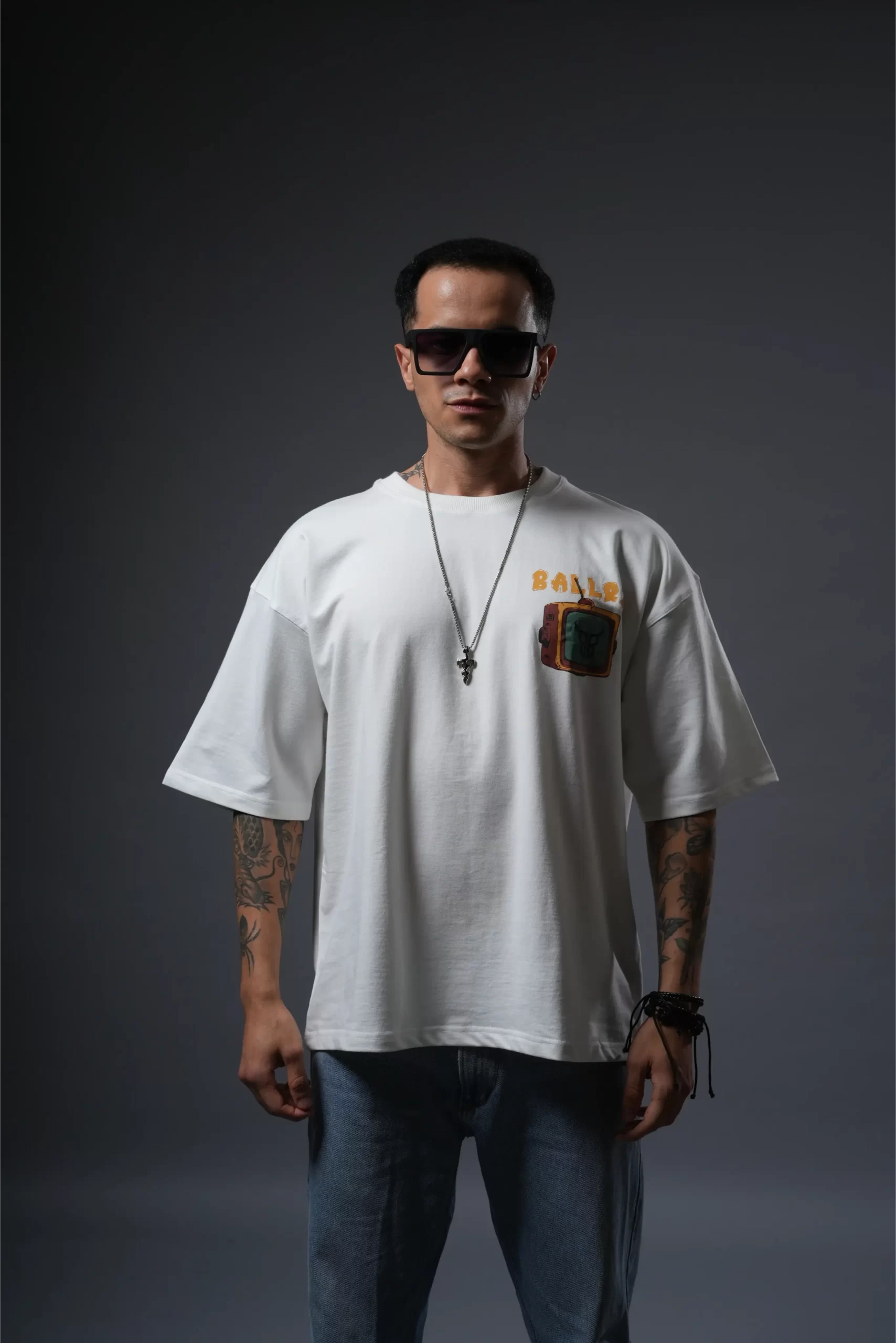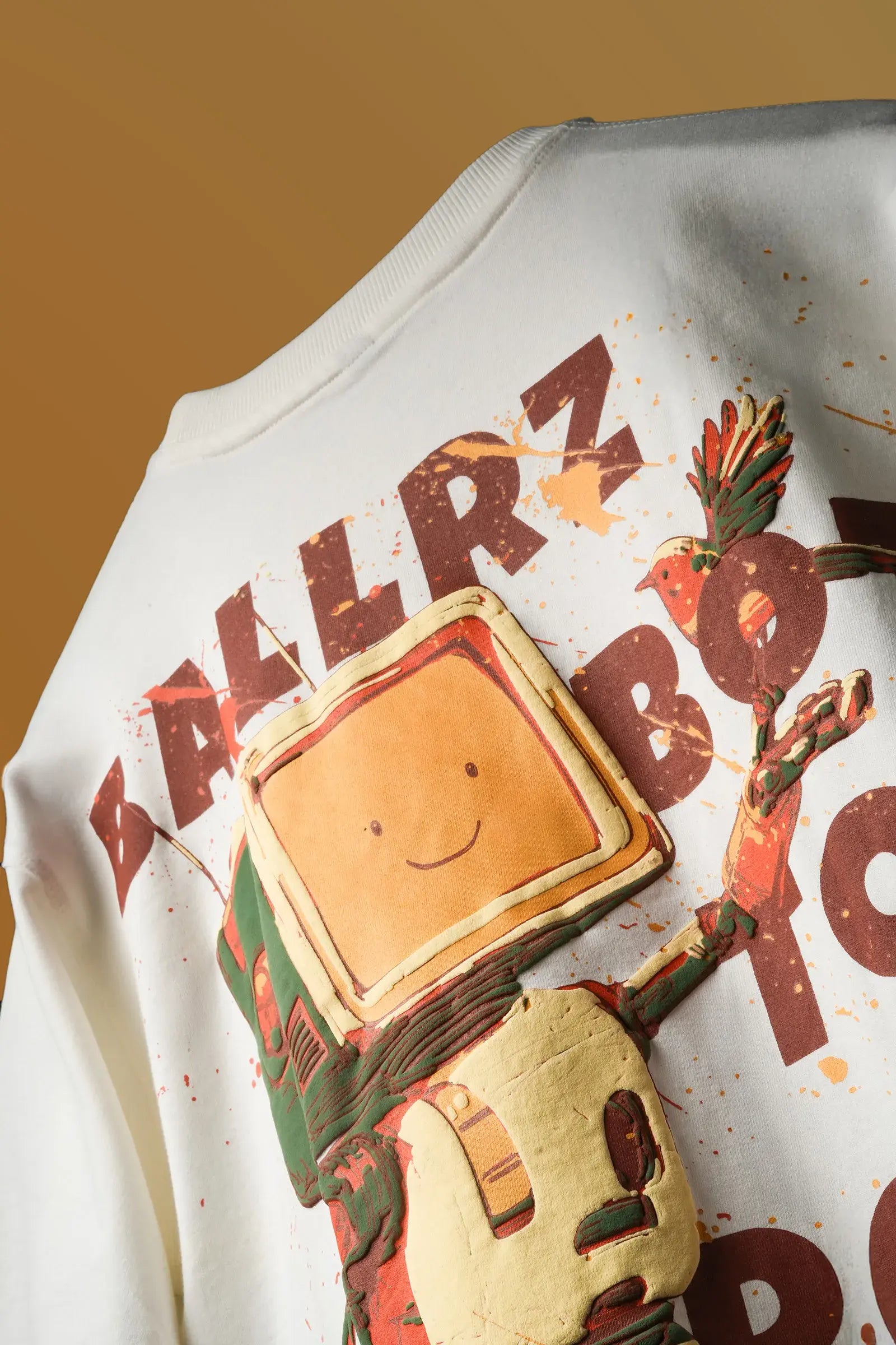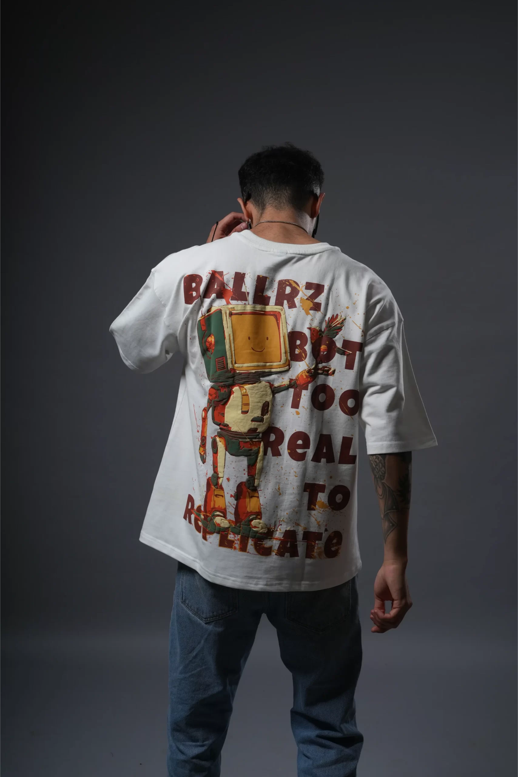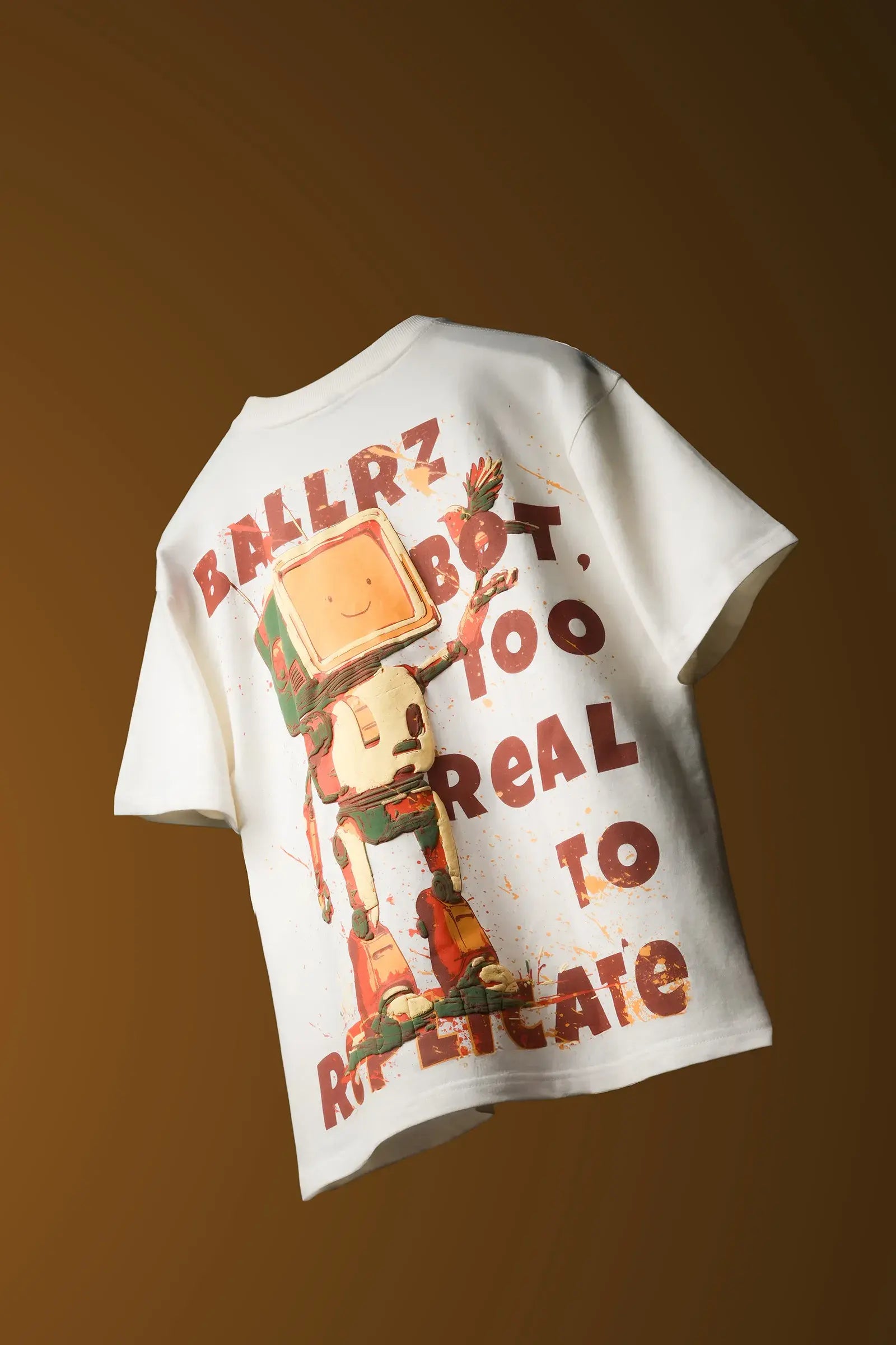 Made from premium heavyweight cotton in crisp white, this oversized tee blends playful futurism with raw street appeal. The front features a compact BALLRZ logo patch in amber tones, while the back explodes with a bold graphic of a retro robot and the statement: